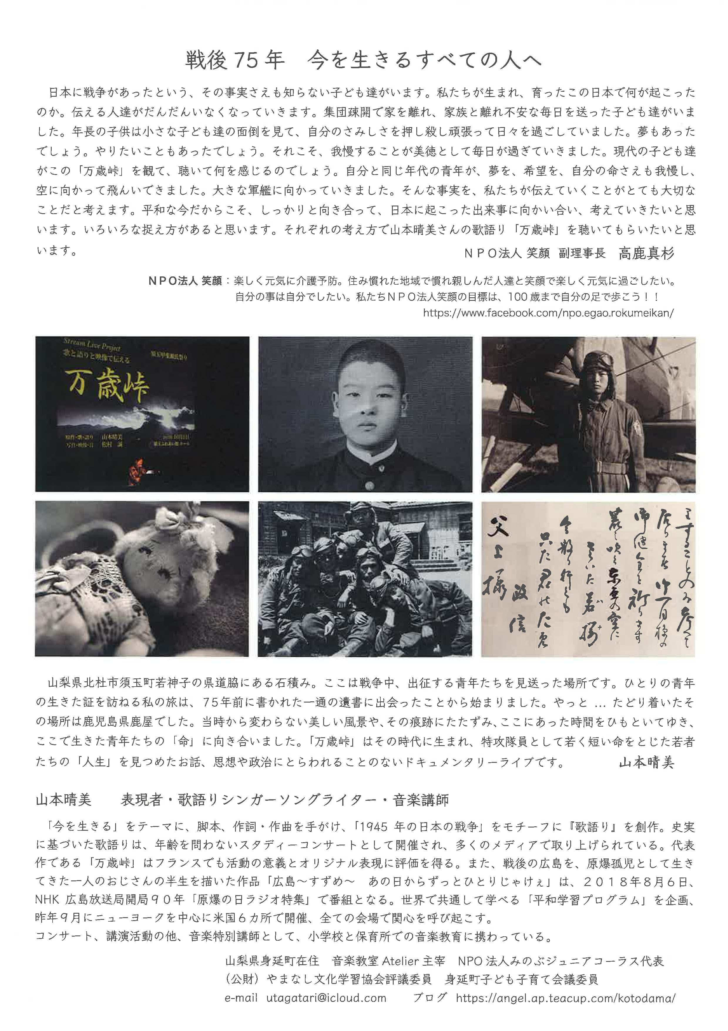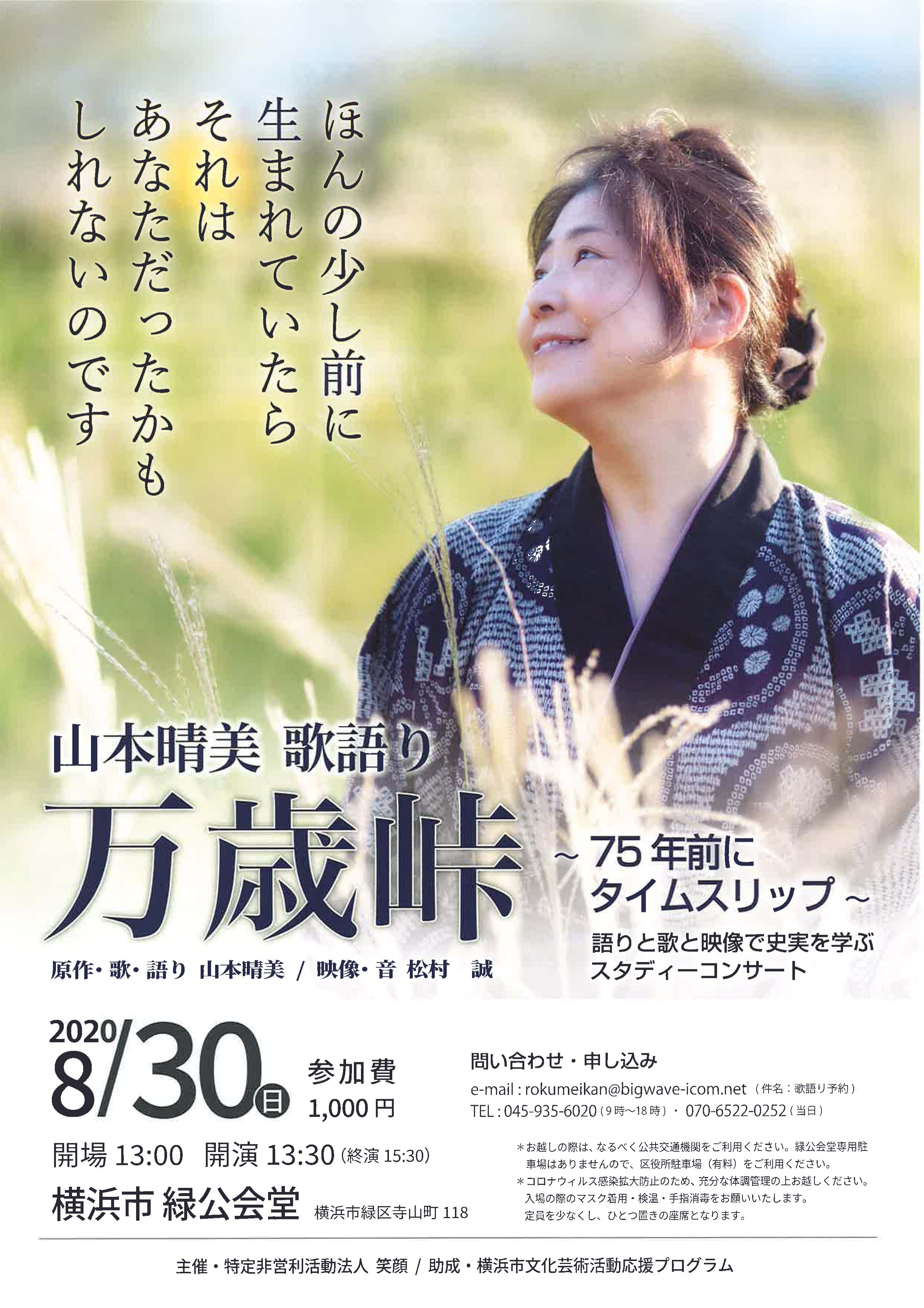 催物のお知らせ「山本晴美 歌語り 万歳峠 ~75年前にタイムスリップ~ 語りと歌と映像で史実を学ぶスタディーコンサート」